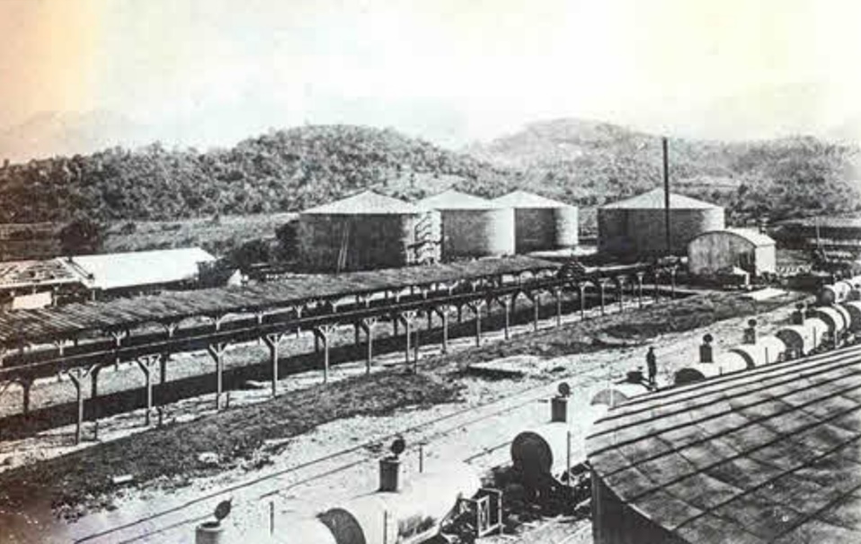 Начало трассы трехкилометрового нефтепровода в Батуми, построенного по проекту Шухова от резервуарной нефтехранилищной станции. На снимке четыре цилиндрических резервуара Шухова. 1886 г.